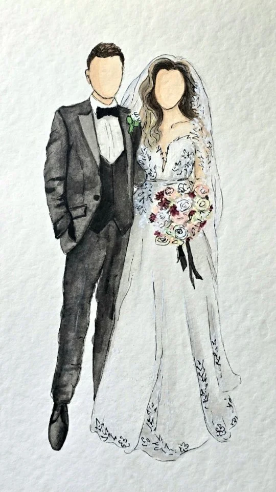 For wedding bookings, the bride and groom receive a complimentary A5 hand-painted illustration, included within the package price — a special keepsake from your day.